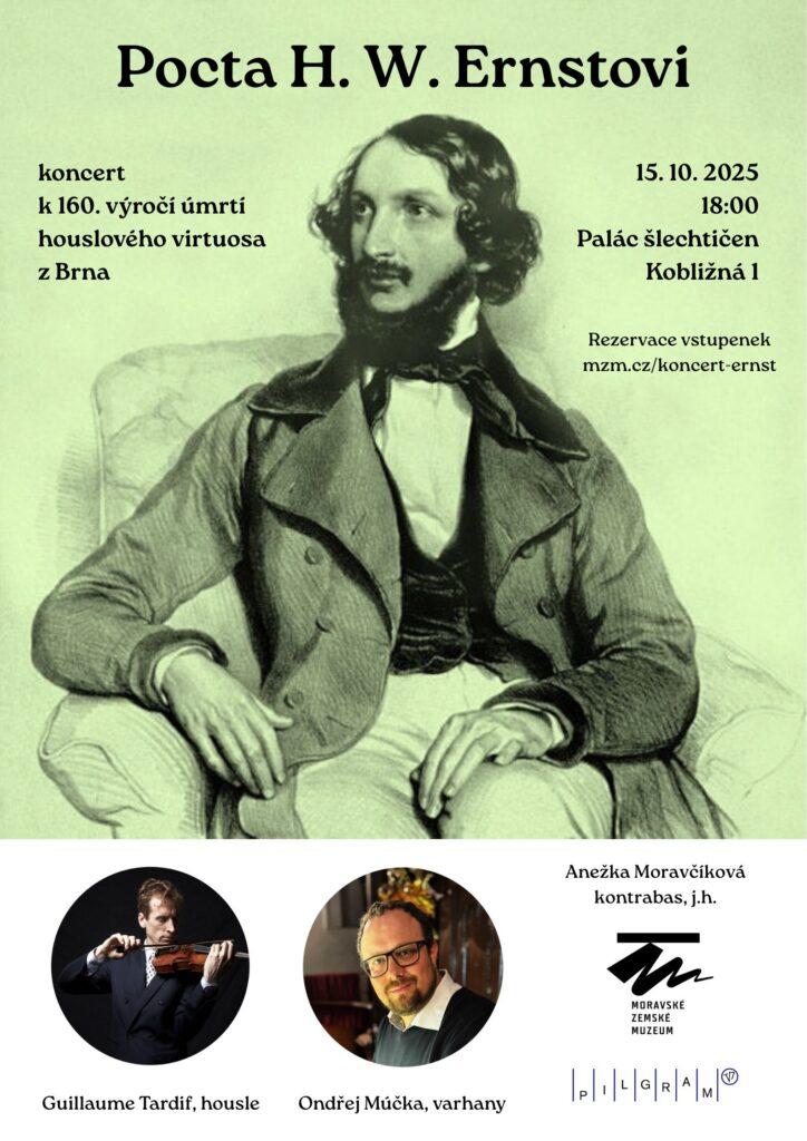 Kanadský houslista a univerzitní profesor Guillaume Tardif (University of Alberta, Edmonton) připomenul brněnskému publiku pozapomenutého rodáka, kterého zná celý hudební svět. Heinrich Wilhelm Ernst (1812–1865) se proslavil jako houslový virtuos a skladatel, ve své době byl označován za nástupce Paganiniho. Prof. Tardif za netypického doprovodu varhan, které se nacházejí v bývalé kapli Paláce šlechtičen, uvedl klasická díla jako Poslední růže léta, Elegie či variace na Benátský karneval, ale i méně známý program. Za varhany usedl zkušený brněnský varhaník, regenschori svatojakubského kůru a organolog Ondřej Múčka. Část skladeb doprovodila na kontrabas hráčka brněnské filharmonie Anežka Moravčíková.